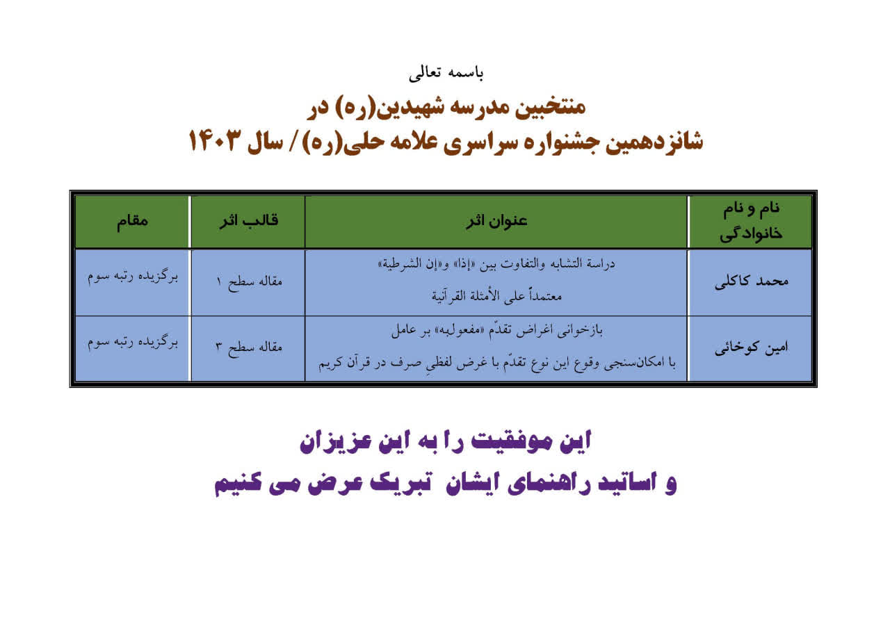 منتخبین مدرسه شهیدین (ره) در شانزدهمین جشنواره سراسری علامه حلی (ره) سید محمد حسین طباطبایی ۲۰۲۵-۱۲-۰۹ Hits: ۴۲ منتخبین مدرسه شهیدین (ره)در شانزدهمین جشنواره سراسری علامه حلی (ره)